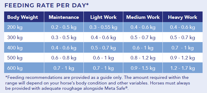 - SMALL FEED, SAFE RESULTS: Meta Safe® delivers a concentrated blend of essential vitamins, minerals and amino acids at a low daily feeding rate. This reduces the amount of hard feed required to meet daily nutrient needs, making Meta Safe® the safe choice for good doers or overweight horses.