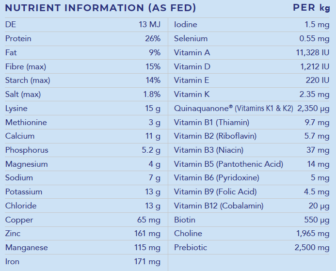Micronized Beans, Micronized Lupins, Sunflower Seeds, Protein Meals, Cereals, Bran, Pollard, Canola Oil, Rice Bran Oil, Molasses, Calcium Carbonate, Magnesium Oxide, Potassium Chloride, Salt, Hygain® Vitamin and Mineral Premix (including Heat Stable Vitamins and Chelated Mineral Proteinates), Hygain® pH Balancer (Natural Mineral Buffer), Lysine, Prebiotics & Quinaquanone® (Constituent of Bonafide®, Bio-Available Vitamins K1 & K2).